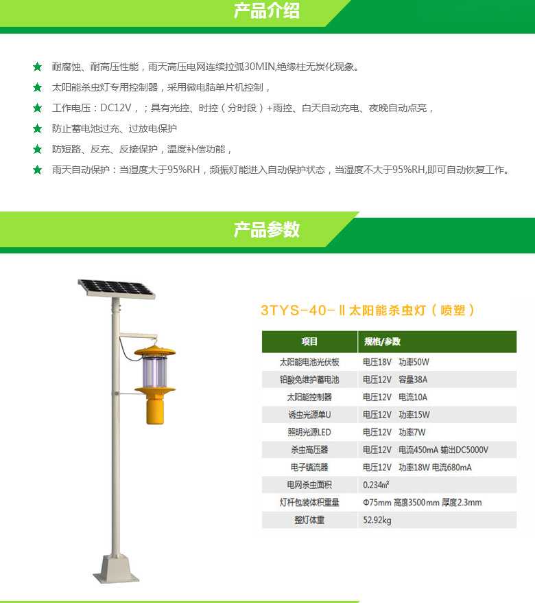天意新能源制造的自动清虫杀虫灯灭虫效果好,可以诱杀森林害虫,果树害虫,棉花害虫,蔬菜害虫,水稻害虫,麦类害虫,杂粮害虫,仓储害虫,草原害虫,地下害虫等。杀虫原理是利用害虫趋光性进行诱杀的一种物理防治方法,利用害虫较强的趋光、趋波、趋色、趋性信息的特性,将光的波长、波段、波的频率设定在特定范围内,近距离用光、远距离用波,加以诱到的害虫本身产生的性信息引诱成虫扑灯,灯外配以电击式高压电网触杀,使害虫落入灯下的接虫袋内,达到杀灭害虫的目的。