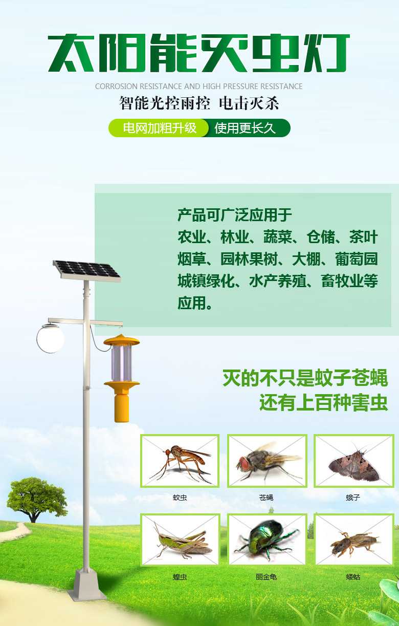 频振式太阳能杀虫照明一体灯具有光控、时控、雨控、过充、过放?;すδ芗拔⒌缒宰远;は低?。全天候,不怕水,耐高温,防腐蚀,移动方便。园林公园,别墅群,庭院,药材基地、蔬菜基地、茶园等场地使用。