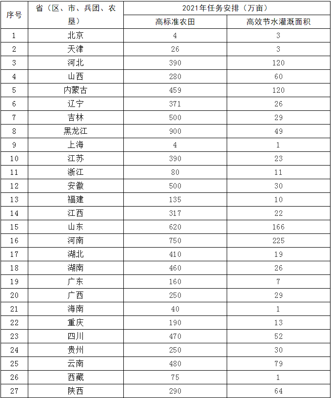 适应确保国计民生要求,以保障国家粮食为底线,大力实施高标准农田建设工程,加快补齐农田基础设施短板,提升粮食产能,2021年全国计划新建高标准农田1亿亩、统筹发展**节水灌溉1500万亩。各地要进一步优化高标准农田项目布局,优先在永久基本农田和“两区”实施,集中力量加快小麦、稻谷生产功能区高标准农田建设,提升口粮**保障水平。多渠道统筹整合资金,加大建设投入,确保高标准农田建设质量效益明显提升。
