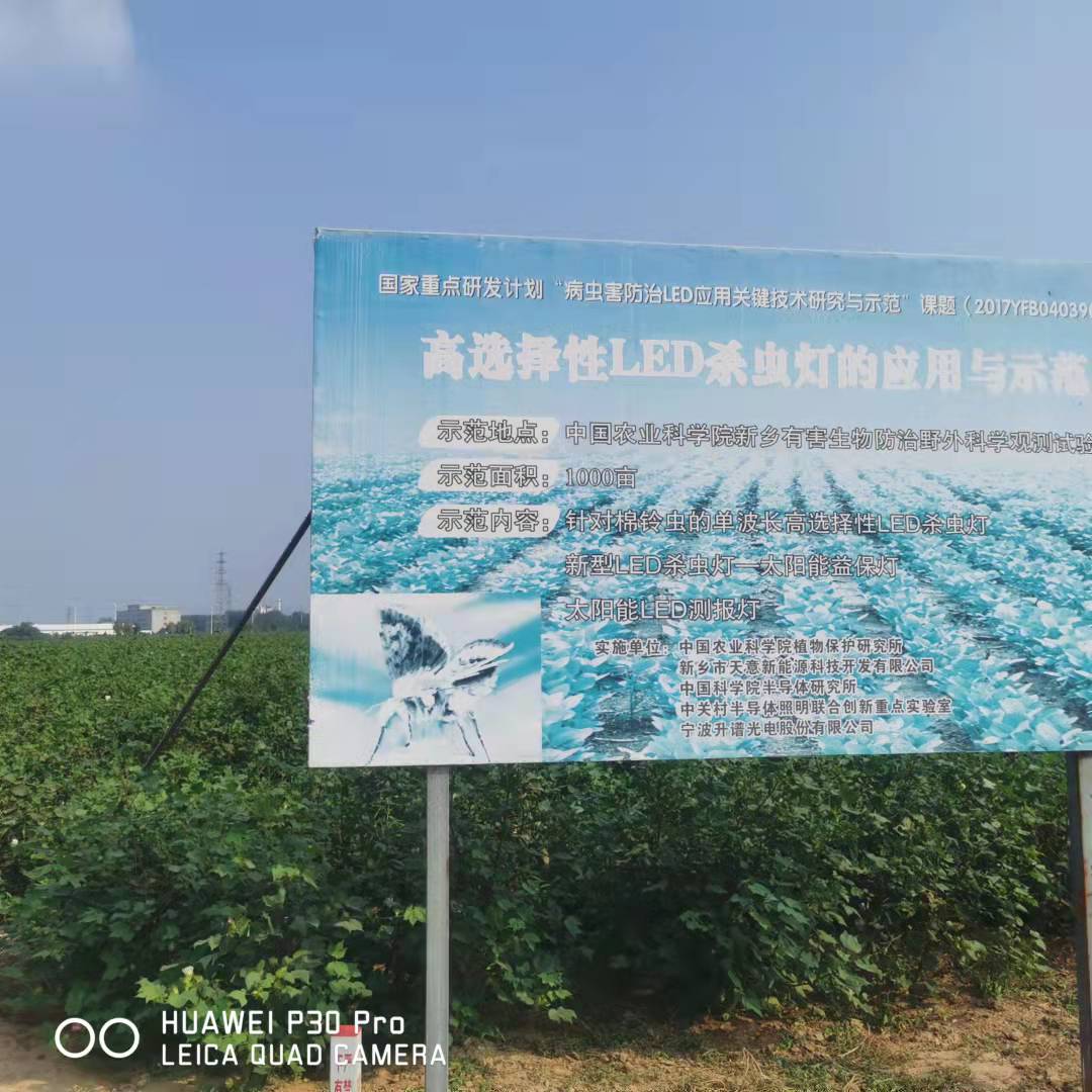天意新能源积极配合中国科学院针对杀虫灯在LED光源及各种波段上的效果研究与测试,针对棉铃虫的防治,以及杀虫灯在大田虫害防控中起到的作用,都会根据科学院的**们给出的数据作为总结来进行技术调整与改进,这也是天意新能源杀虫灯在这十几年一直收到客户青睐的重要原因之一。